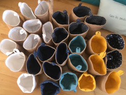 Je suis très contente de mes achats. Le service d'expédition est rapide. J'ai pu avoir le texte de la série "sous les pavés ..." avec un tissu bleu ciel. Mes pochons et mon panier sont très bien.