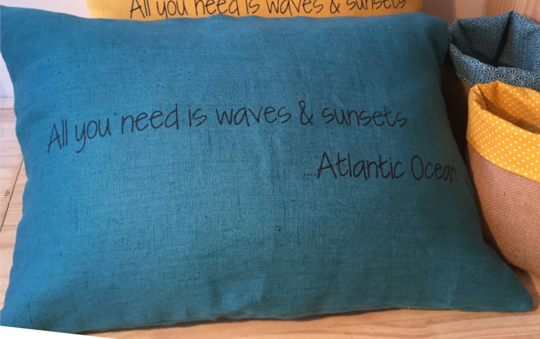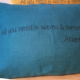 Coussin série "All you need .." lin bleu canard sérigraphie noire.