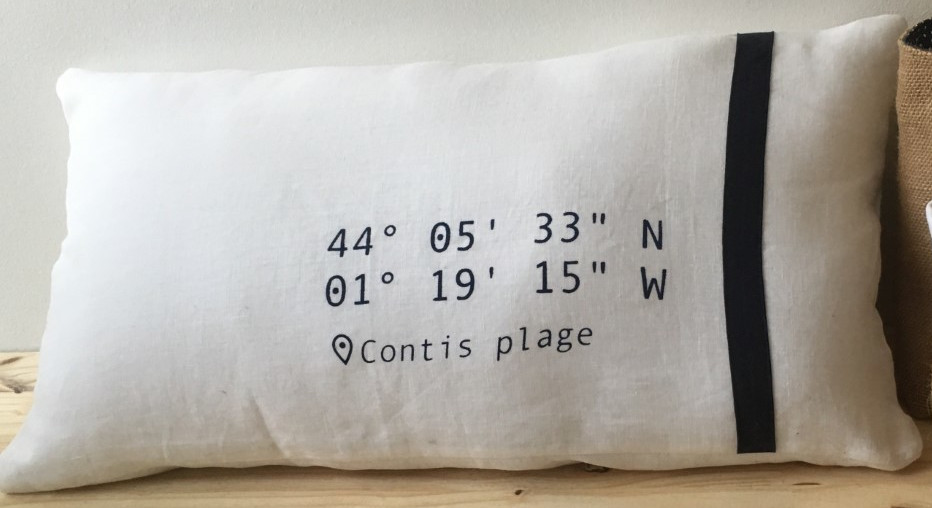 Coussin série "Coordonnées" lin blanc sérigraphie noire.