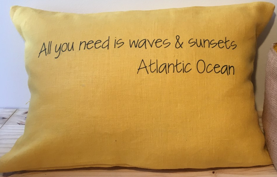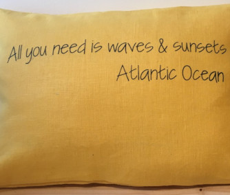 Coussin série "All you need .." lin jaune sérigraphie noire.