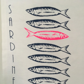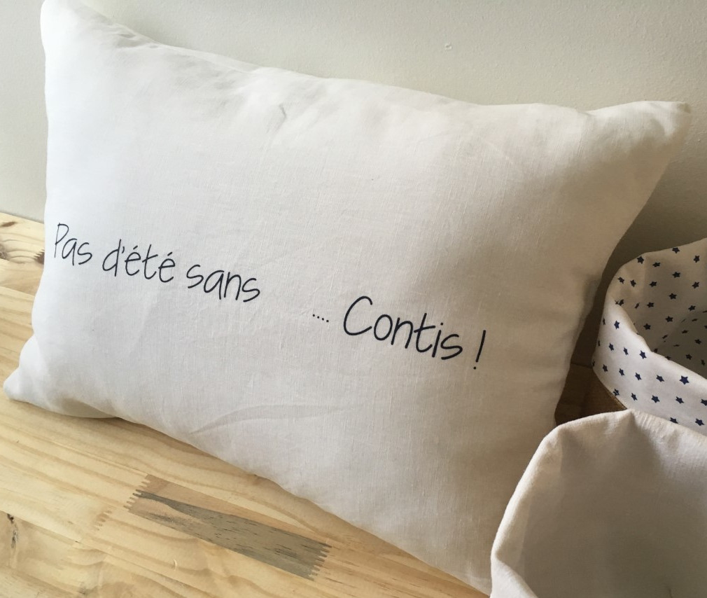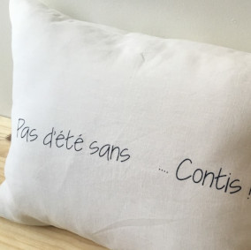 Coussin série "Pas d'été ..." lin blanc sérigraphie noire.